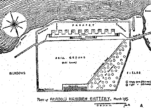 I was much puzzled by the fact that the Allied fleet, despite its large expenditures of ammunition, had not been able to hit this Dardanos emplacement. I naturally thought at first that such a failure indicated poor marksmanship, but my German guides said that this was not the case. All this misfire merely illustrated once more the familiar fact that a rapidly manoeuvring battleship is under a great disadvantage in shooting at a fixed fortification. But there was another point involved in the Dardanos battery. My hosts called my attention to its location; it was perched on the top of the hill, in full view of the ships, forming itself a part of the skyline. Dardanos was merely five steel turrets, each armed with a gun, approached by a winding trench.