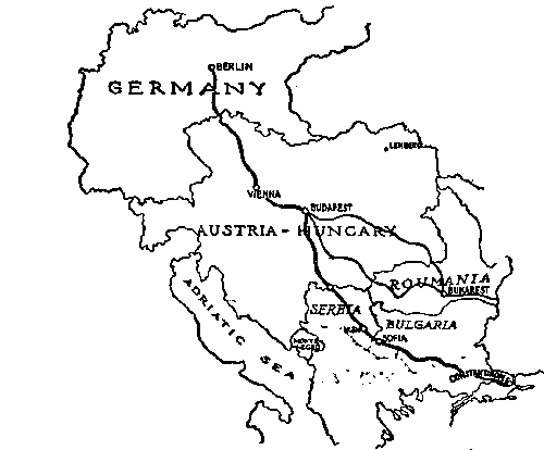 I wish to direct particular attention to this railroad, for it was, after all, the main strategic prize for which Germany was contending. After leaving Sofia it crosses northeastern Serbia, the most important stations being at Nish and Belgrade. From the latter point it crosses the River Save and later the River Danube, and thence pursues its course to Budapest and Vienna and thence to Berlin. Practically all the military operations that took place in the Balkans in 1915-16 had for their ultimate object the possession of this road. Once holding this line Turkey and Germany would no longer be separated; economically and militarily they would become a unit. The Dardanelles, as I have described, was the link that connected Russia with her allies; with this passage closed Russia's collapse rapidly followed. The valleys of the Morava and the Maritza, in which this railroad is laid, constituted for Turkey a kind of waterless Dardanelles. In her possession it gave her access to her allies; in the possession of her enemies, the Ottoman Empire would go to pieces. Only the accession of Bulgaria to the Teutonic cause could give the Turks and Germans this advantage. As soon as Bulgaria entered, that section of the railroad extending to the Serbian frontier would at once become available. If Bulgaria joined the Central Powers as an active participant, the conquest of Serbia would inevitably follow, and this would give the link extending from Nish to Belgrade to the Teutonic powers. Thus the Bulgarian alliance would make Constantinople a suburb of Berlin, place all the resources of the Krupps at the disposal of the Turkish army, make inevitable the failure of the Allied attack on Gallipoli, and lay the foundation of that Oriental Empire which had been for thirty years the mainspring of German policy.