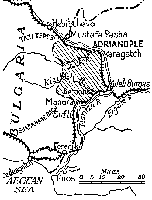 Germany, said Weitz, had won over Bulgaria by doing something which the Entente had not been able and willing to do. It had secured her the possession at once of a piece of coveted territory. Serbia had refused to give Bulgaria immediate possession of Macedonia; Turkey, on the other hand, had now surrendered a piece of the Ottoman Empire. The amount of land in question, it is true, was apparently insignificant, yet it had great strategic advantages and represented a genuine sacrifice by Turkey. The Maritza River, a few miles north of Enos, bends to the east, to the north, and then to the west again, creating a block of territory, with an area of nearly 1,000 square miles, including the important cities of Demotica, Kara Agatch, and half of Adrianople. What makes this land particularly important is that it contains about fifty miles of the railroad which runs from Dedeagatch to Sofia. All this railroad, that is, except this fifty miles, is laid in Bulgarian territory; this short strip, extending through Turkey, cuts Bulgaria's communications with the Mediterranean. Naturally Bulgaria yearned for this piece of land; and Turkey now handed it over to her. This cession changed the whole Balkan situation and it made Bulgaria an ally of Turkey and the Central Powers. Besides the railroad, Bulgaria obtained that part of Adrianople which lay west of the Maritza River. In addition, of course, Bulgaria was to receive Macedonia, as soon as that province could be occupied by Bulgaria and her allies.