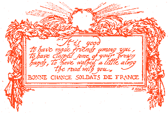 The epic and heroic quality of France's whole history, and especially of that chapter of which we were eyewitnesses, the quenchless spirit and unfaltering will of her people, ---the democracy, the comradeship, and above all, the calm, unboasting, matter-of-fact courage of her troops,---kindled something akin to veneration in all of us. The Field Service motto was "Tous et tout pour la France." We all felt it. We all meant it. It is forever ours.