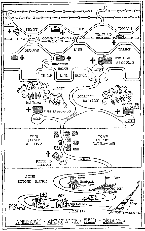 The use of the automobile for the rapid transportation of wounded, which had reached no considerable development before the great European war, rendered possible in this war the surgical treatment of wounded under much more favorable circumstances than in previous wars. Its adoption, however, inevitably suggested many modifications in the tables of organization of the army medical service, modifications which were not so thoroughly recognized in the American Army as in that of France. In the American Army, motor-ambulances were driven, looked after, and supervised by men with medical training, just as had been the horse-drawn ambulances of other wars, the assumption being that with long distances between dressing-stations and hospitals, such as were familiar in Mexico and the Philippines, surgical or medical treatment might be advantageously administered en route. Such conditions did not exist when motor-cars decimated distance, and above all in France with its complex network of railroads and its closely grouped towns and villages in which hospitals could be established. Surgical and medical training had, therefore, no part to play in the ambulance service in France. The French Army discovered at the very beginning of the war that the only rôle of this service was to get the wounded as rapidly and comfortably as possible from the battle-line to a field hospital, usually only a few miles back, where they could receive proper treatment under advantageous conditions. What was required of an ambulance section was to furnish to the Division, wherever and whenever required, motor-ambulances in sufficient number, adequately supplied with gasoline, tires, and spare parts, properly looked after by motor mechanics, and properly handled by experienced drivers. From the French point of view it, was as illogical to expect doctors and surgeons to accomplish this work successfully as it would be to ask automobile experts to do surgical and medical work in the dressing-stations and hospitals. The divisional surgeon in the French Army had a certain number of ambulances and drivers, under the command of an automobile officer, placed at his disposal by the Automobile Service. The surgeons decided the daily work to be performed by the section, but they had nothing whatsoever to do either with its internal administration and discipline or with the upkeep of its membership and material.