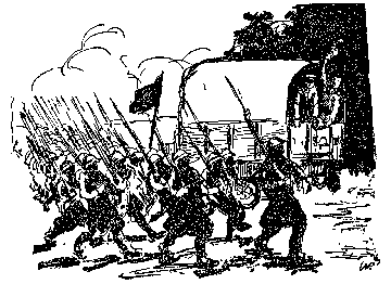 Plates and table hardware were seldom washed, and it often happened that nothing was cleaned for several meals, while to add to the unpleasantness of the situation, hostlers kept opening and closing a door which was the entrance to the foulest stable imaginable. Possibly there would have been a general "kick" on the part of the Section if it had not been for the fact that we were worn out from the hard work and long hours of driving, which sometimes amounted to over 200 kilometres per day per car.