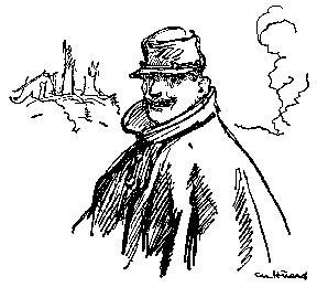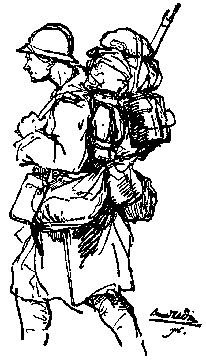 This at the front. Meanwhile, events at the rear were not entirely devoid of interest. The Section, or rather the part of it which was not up at the poste was at supper when something suspiciously like an arrivée was heard in the immediate vicinity. The "older" men looked at one another, the rookies looked at the "General,"(#1) who went on with his soup. A second came in, still closer; then a third which knocked the plaster from the ceiling, a generous piece of which fell in the "General's" soup. He rose, calmly looked round and muttered, "Well, I'll be damned," --- and left those parts. He did n't run, for that would have been undignified, but he simply left --- and he was n't the last to reach the shelter of a neighboring and friendly haystack some hundred yards off out in the open. --