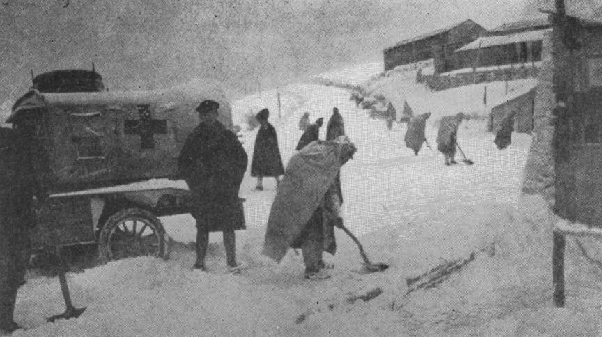 The car I was to relieve got a trip late one night in what was, even at Mittlach, a terrific rainstorm. The next morning it continued raining, but I could see the peaks of the mountains covered with snow. Late in the afternoon, just after dark, the familiar sound of a Ford brought me out of the poste de secours, and I found Rice, with his car covered with snow which even the rain had n't yet melted. His story was of helping the car I had relieved, and of having worked all morning, in their efforts to pull it back on the road from which a heavy ammunition wagon had pushed it, neither vehicle being able to stick to the icy road. Farther on, he had met continual snowdrifts. His eagerness to bring me chains, my only chance of getting up, persuaded him to keep on, and he eventually got through with everybody's help on the road. We decided to wait until the storm was over --- our only alternative --and proceeded to make ourselves as comfortable as we could, which means a stove, somewhere to sleep, and plenty of books to read and tobacco to smoke. It was four days before the snow let up and we had visions of a long and lonely winter; but as soon as the storm broke we started up, and, as it proved, in the nick of time, as the five kilometres along the crest were again swept by snow and sleet and drifts were beginning to form. The Mittlach service had to be abandoned after this, although in late November and early December a car could go through, but it was impossible to assure the service and it was found better to have sleighs and wagons do the work.