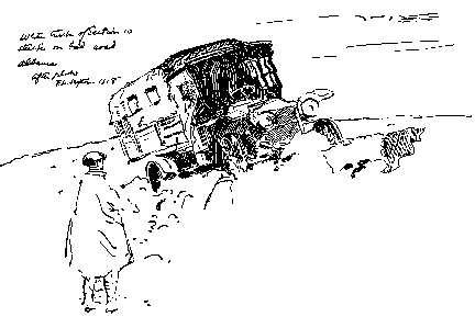 STILL raining when I got up. Left for Zemlak with three assis. Roads pretty bad, but some of the worst places had been fixed. Car ran poorly at first, and I had to change spark-plugs twice. At Zemlak we had to go on to Biklista; the road was terrible --- worse than the mountains. Got stuck in a stream. Had a nice lunch at Biklista and started back. Got stuck in same stream with the car tilted so that the gas wouldn't run to the carburetor. After about an hour twenty-five Senegalese came along and pushed me out. Stayed at Zemlak for the night to bring up the ravitaillement. Got up at 6.30 and tried to start my car. The water in the gas-tank was at the bottom and had frozen. Had a terrible time; but finally got it started. Snowing all the time, and the road was difficult. Got to Gorica about noon and carried five blessés to Gorica là-bas. Up to the poste about 3.30, and made one trip with five assis. From then on until about 3 A.M. I made five trips. On one trip a man died on the stretcher beside the car, and another one died about ten minutes after I got to the hospital.