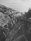 After the meal, we climbed about fifteen hundred feet along the ground that the French had advanced over in March in deep snow, against machine-gun nests. We had so often had these positions pointed out to us by soldiers passing the poste that we were glad to see how they looked in reality. Here on the top the Saxon troops had rushed to stop the furious advance of the French and had placed machine guns there, which brought the advance to a standstill. The stone walls, which took the place of trenches, were not more than one hundred and fifty feet apart, and between them lay dead Turks who had fallen in a futile attack six weeks before. This accounted for the smells, which we at first thought might come from dead horses, until we realized that no horses could get up there. The soldiers have built here attractive little stone houses. Perhaps during centuries to come lone sheep-herders, grazing flocks high up there, will wonder who the queer people were who lived so far from water.