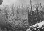 WE went wood-gathering beyond Thuizy in a forest of huge first-growth hardwood trees. Shells had done awful damage there. The magnificent trees were shattered and torn and thrown into all kinds of fantastic positions. One giant maple remained practically intact , with a tiny observation post riddled by éclats hidden away up at the top, perhaps a hundred feet in the air. The ground was torn up by the shells, and fallen branches lay around knee-deep, which added greatly to the difficulty of our work.