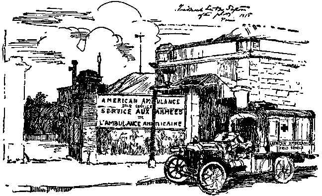 Were you fortunate and were you rushed through in a week to join an old section in the field, or did things break badly for you so that you were held in Paris for some time? Do you remember the nondescript costume you went around in for the first few days --- a service cap, a khaki flannel shirt, and a civilian suit --- and do you remember the perfect pride you felt the day your uniform came home from Lloyd's and you first sallied forth in it? Then there were the blankets, the cot, and the field equipment to get, the Permis de Séjour, the Permis de Conduire, the Carnet d'Étranger, and all the other French papers to obtain. Your evenings you spent in the big living-room listening to the stories of actual service told by the permissionnaires, those proud men with the soft, flappy caps, who had actually seen that mystic place "the front"; or else you sat on the terrace of the Café de la Paix drinking portos, dined at the Café de Paris, went to the Alhambra or the Folies, and walked all the way home to Passy through the inky-black streets after the Métro had stopped running. Finally, however, your period of preparation was finished by a call to "Steve's" office, where you were then told you were to go out to Section Blank. Section Blank! Will you ever forget Section Blank?
