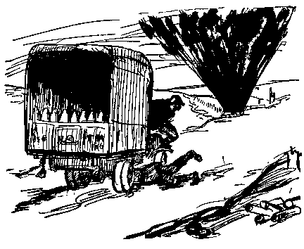 Our attention was next directed to the unloading of the trucks, which was accomplished unassisted, with occasional retreats to the dugout when the shelling appeared to be getting too near. Everybody tackled the unloading with a will, and also showed an equal willingness to dive for shelter when the word was given. After remaining under bombardment from eleven till three in the morning, we finally got all the trucks unloaded and turned round, put a tow-rope on the Ford, and started for camp, which we reached some time after daylight, discovering then that the staff car was practically a wreck.